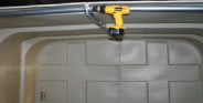 Clamp rear wall together using vise grips. Back should overlap about 3" (check with measuremnt from corner to corner - 92") - Figure C. Where center back overlaps, drill 5/16" holes. Begin in the center 2 holes then 3 holes below center and 3 holes above, spaced out. Bolt back wall together with eight (8) 5/16" x 1" step head bolts. It is recommended that you drill one hole at a time, bolting as you go.